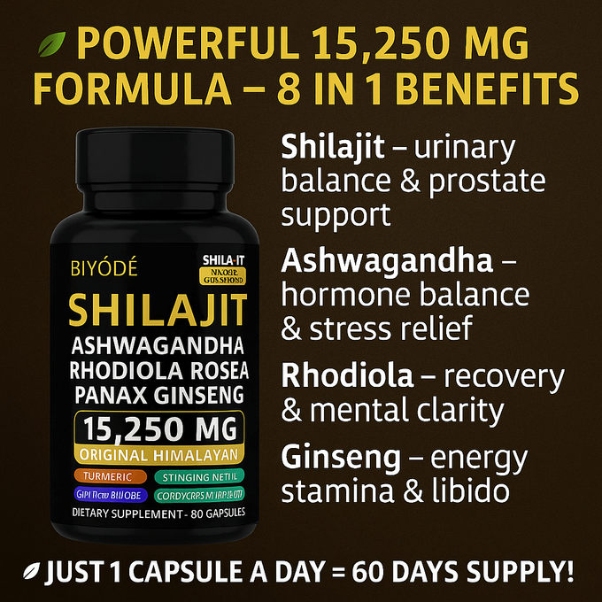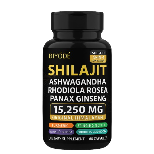 Formulated with a powerful blend of Shilajit (15,250 mg), Ashwagandha, Rhodiola, Panax Ginseng, Cordyceps, Curcumin, and Ginkgo Biloba, these capsules are designed to: